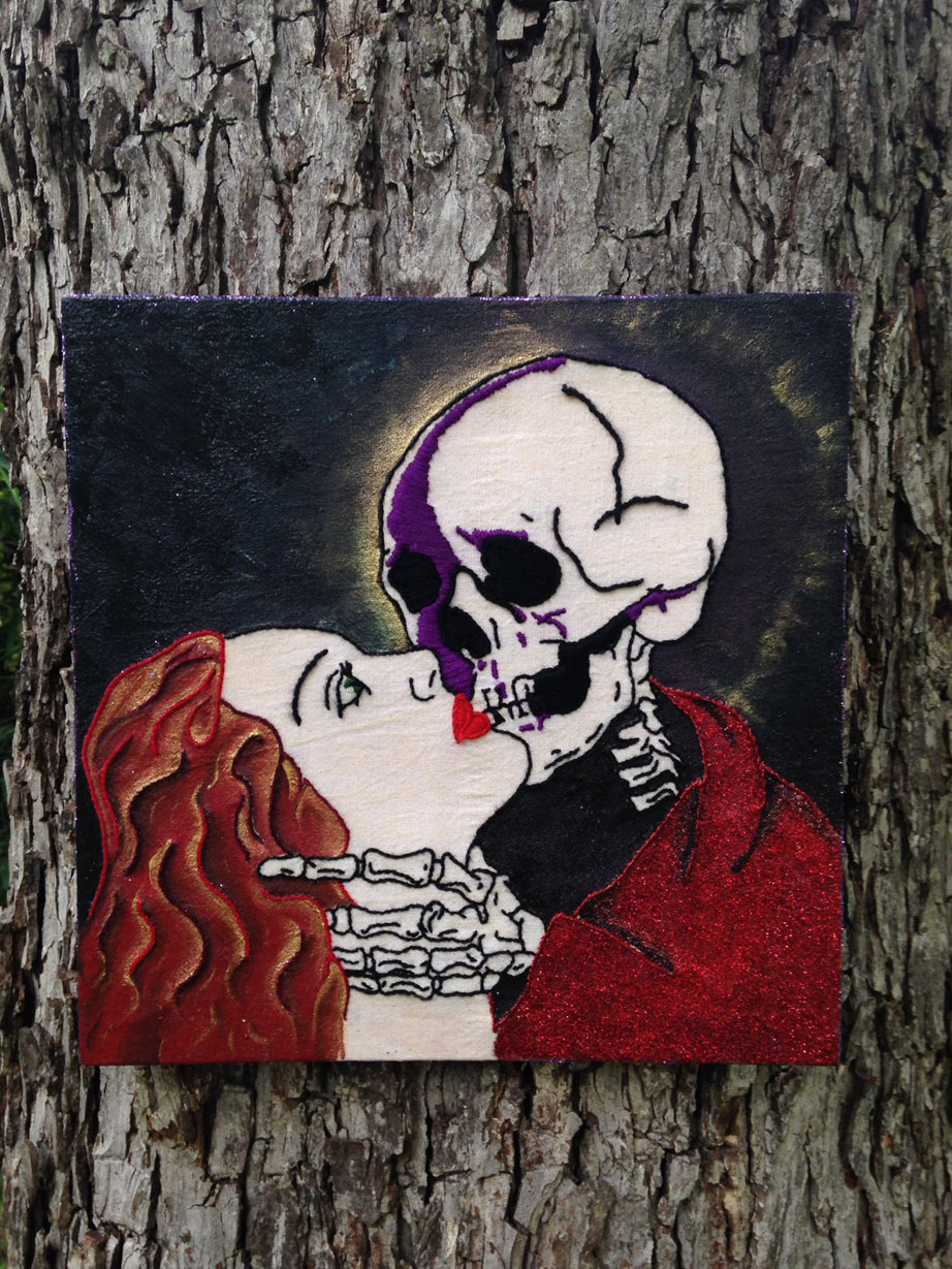Hand embroidered fabric, stretched over wood, then painted and glittered. Glittered a lot.
