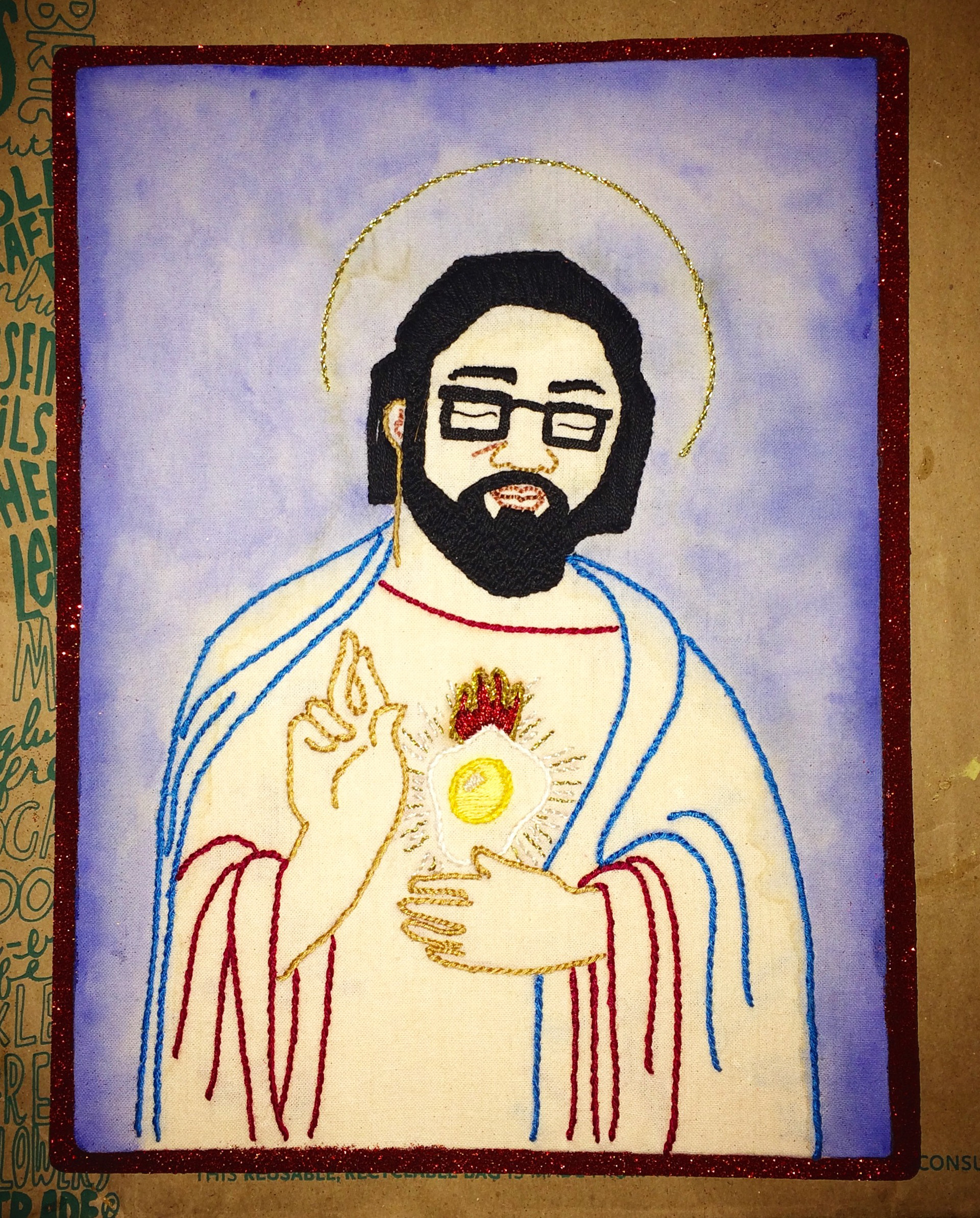 . Hand embroidered cotton, stretched over wood, painted, then glittered.